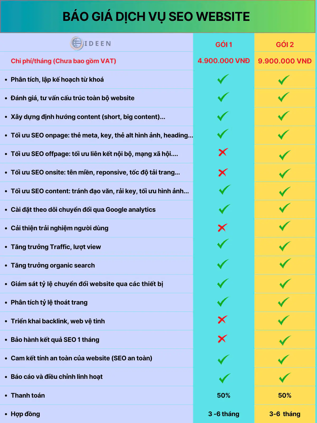 IDeen Media cung cấp các gói dịch vụ SEO chuyên nghiệp, đa dạng, đáp ứng mọi nhu cầu của khách hàng từ doanh nghiệp nhỏ đến các tập đoàn lớn. Dưới đây là bảng giá chi tiết dịch vụ SEO tại IDeen Media: