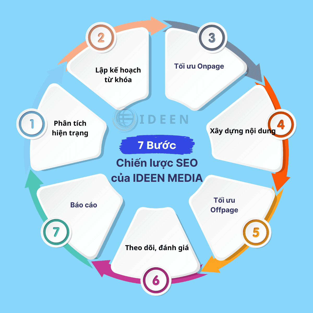 Dịch vụ SEO web tại contentchuanseo.com dựa trên quy trình SEO tổng thể 6 bước, là một phương pháp hiệu quả và đã được chứng minh qua hàng nghìn dự án thành công. Được phát triển bởi IDEEN MEDIA – agency SEO uy tín hàng đầu Việt Nam với hơn 10 năm kinh nghiệm. Dưới đây là chiến lược SEO web tổng thể mà chúng tôi áp dụng: