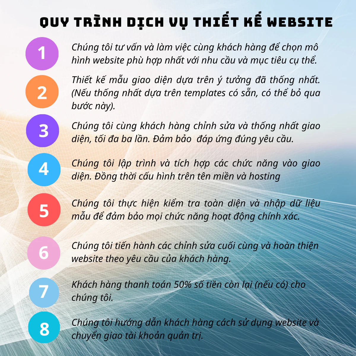 Tùy chỉnh theo yêu cầu cụ thể của khách hàng. Từ bố cục, màu sắc, đến các tính năng đặc biệt. Điều này đảm bảo rằng website của bạn phản ánh đúng bản sắc thương hiệu và phục vụ tốt nhất cho nhu cầu của người dùng.